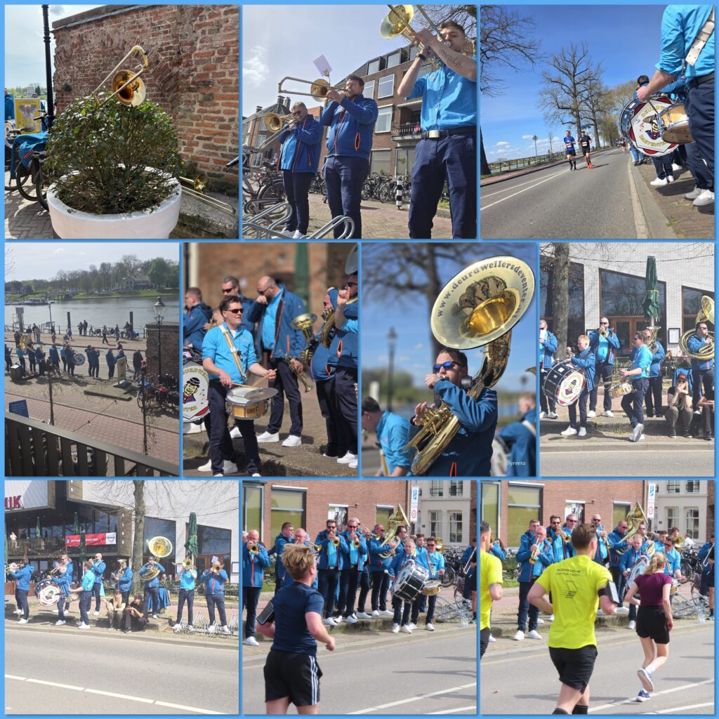 Onze muziek vulde de Welle en kaatste terug van de gebouwen langs de IJssel. We zagen lopers opkijken, lachen, en soms zelfs een klein dansje maken terwijl ze voorbij kwamen. Duimen omhoog, aanmoedigingen over en weer — het gaf ons alleen maar meer energie om door te spelen.